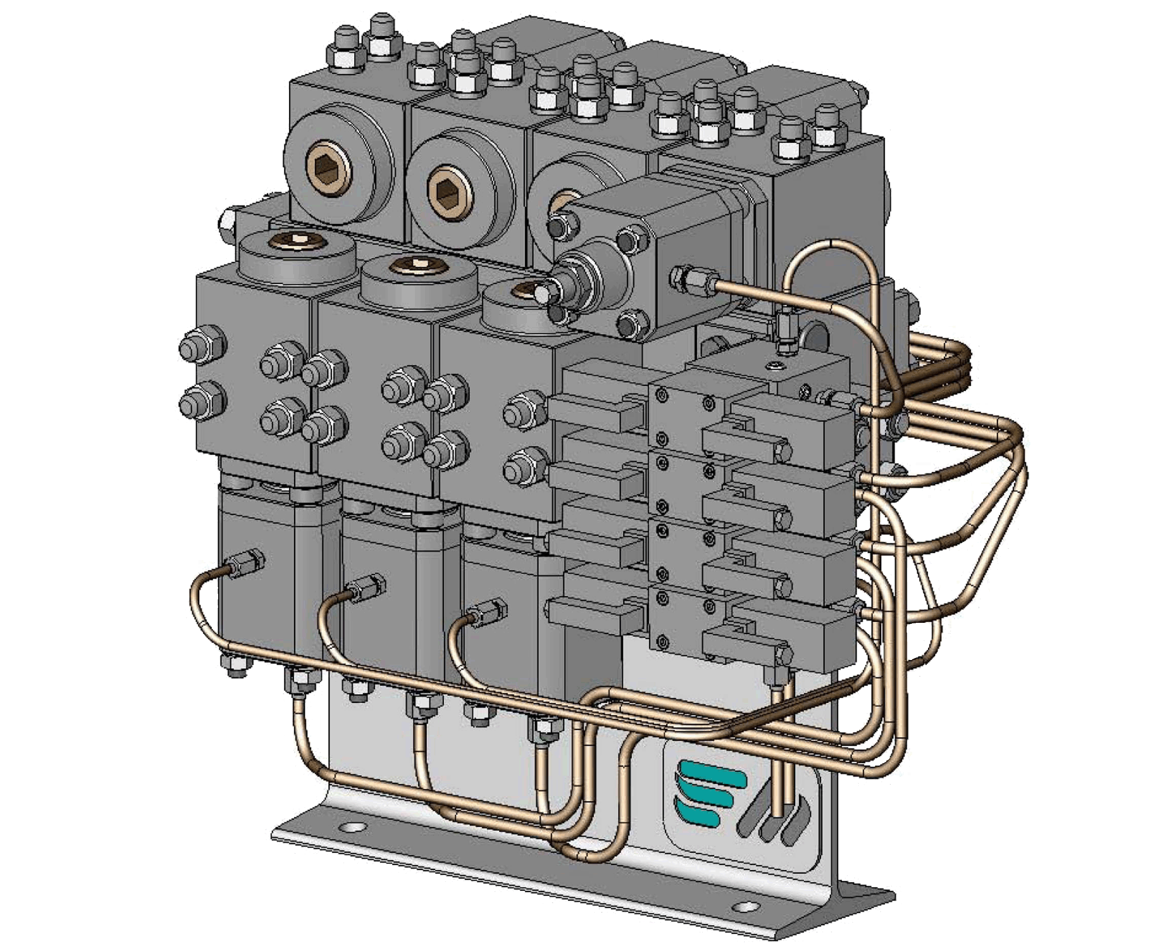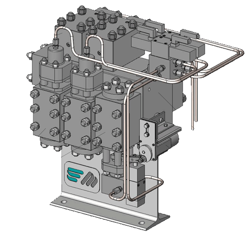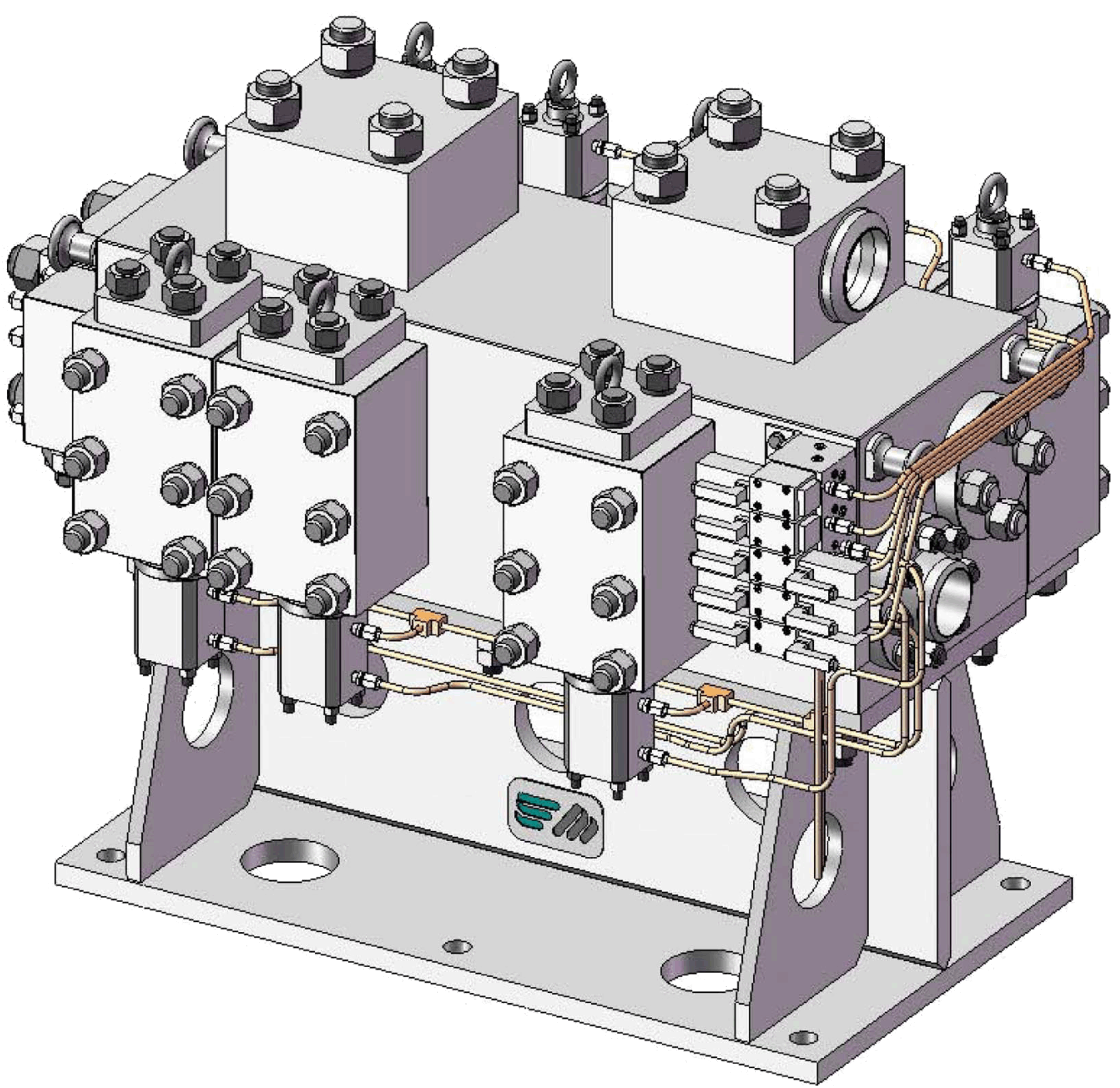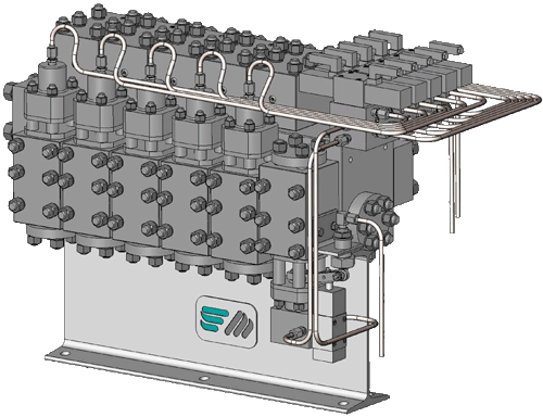 Гидрораспределитель механизации (стола, выталкивателя, фиксатора и т. п.) Ду 25 с приводом от объемной передачи или от шагового электродвигателя. Число клапанов и их расположение зависит от количества вспомогательного оборудования и может быть доведено до 10 шт;